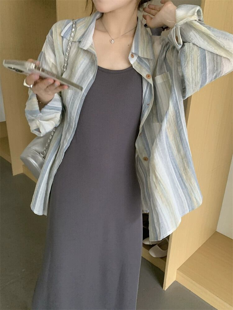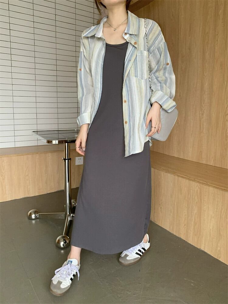 怠惰なスタイルのスーツの女性の春薄い日焼け止めストライプシャツジャケット純粋な欲望ニットサスペンダードレスツーピースセット スプリング 春物 ピュア missk56498693800
