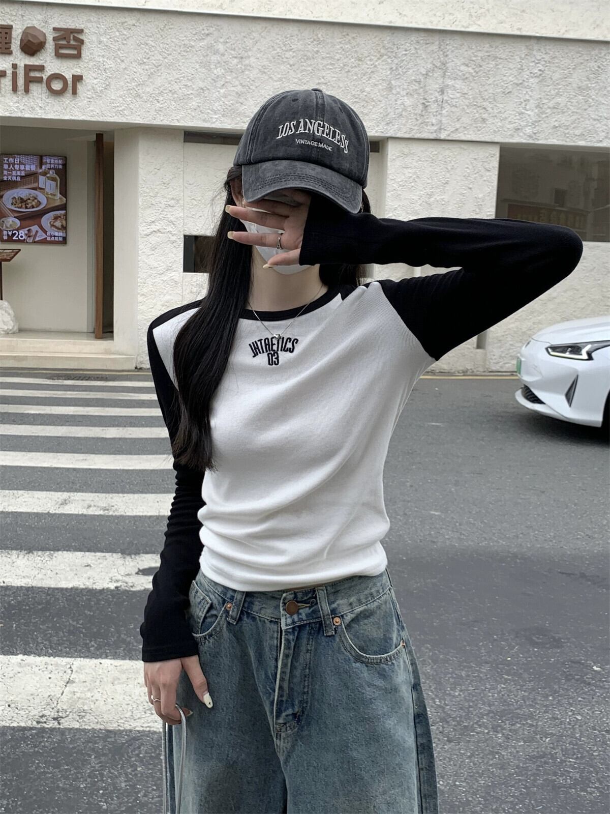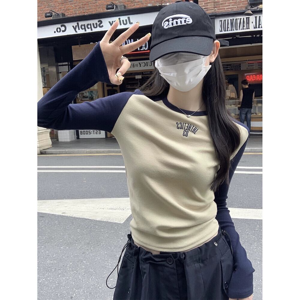 アメリカのコントラストカラー長袖 Tシャツ女性春 2024 新文字刺繍デザインスリムフィットショートトップ ロング スプリング 春物 missk33116122416