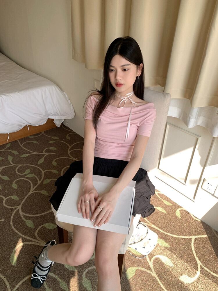 甘いピンクのワンショルダー半袖 Tシャツ女性の夏の 2024 新しい気質スリムショートニッチトップ 大人ガーリー スウィート キュート カジュアル サマー 夏物 missk39826115089