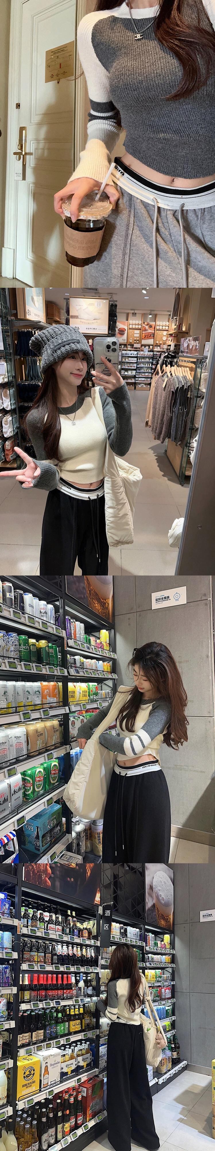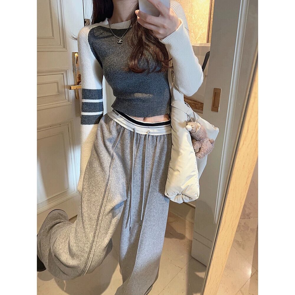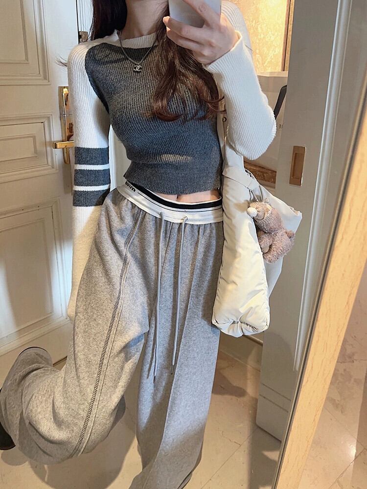 コントラストストライプ長袖セーター女性 2024 春の新デザインスリムフィットショートインナーベースレイヤートップ ロング スプリング 春物 missk83450765587