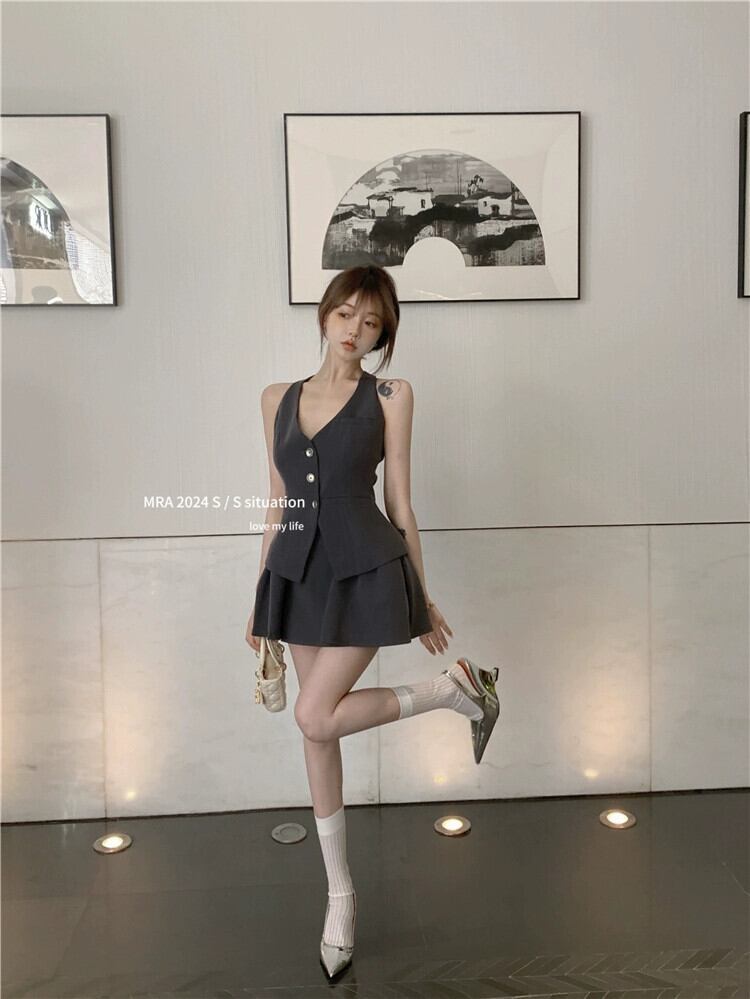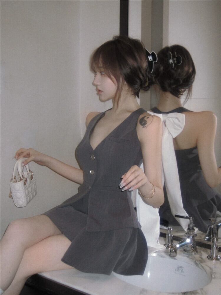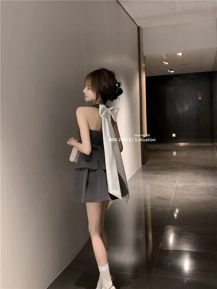ホットガールスーツ女性の夏フレンチスタイル背中の開いた蝶ネクタイウエストベストベストプリーツスカートツーピースセット リボン サマー 夏物 missk31773994238
