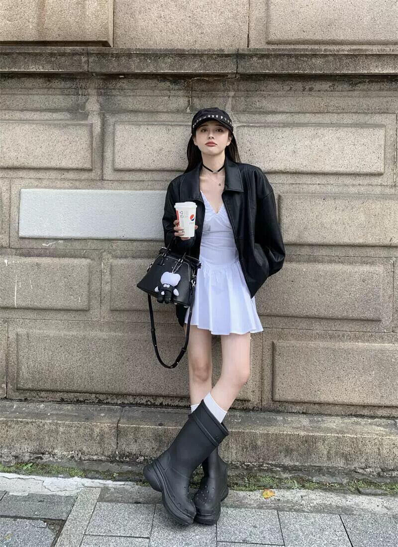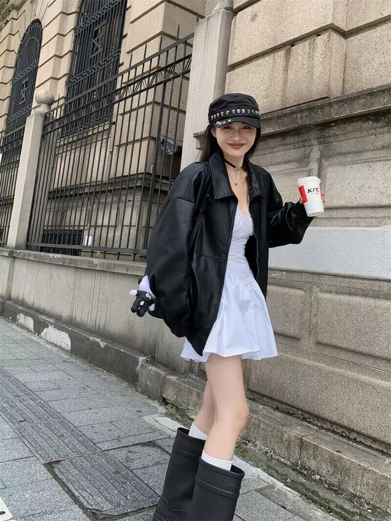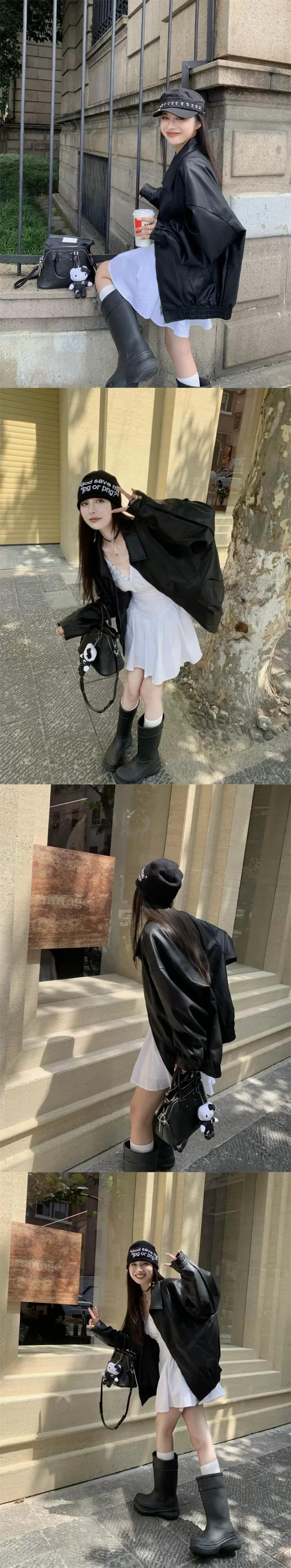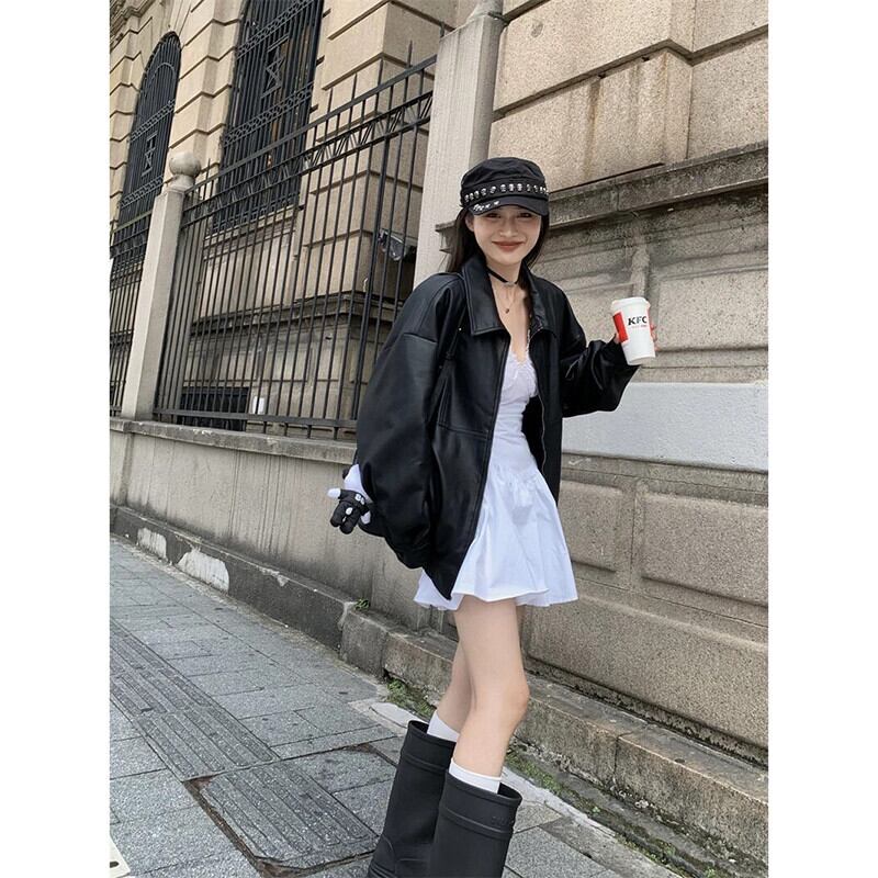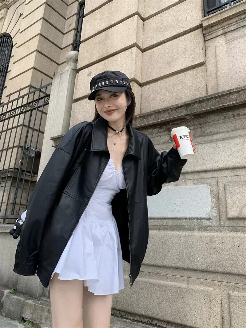 レトロラペル長袖オートバイレザージャケット春 2024 アメリカルーズミッドレングスジッパートップ女性 ロング スプリング 春物 missk66168465375