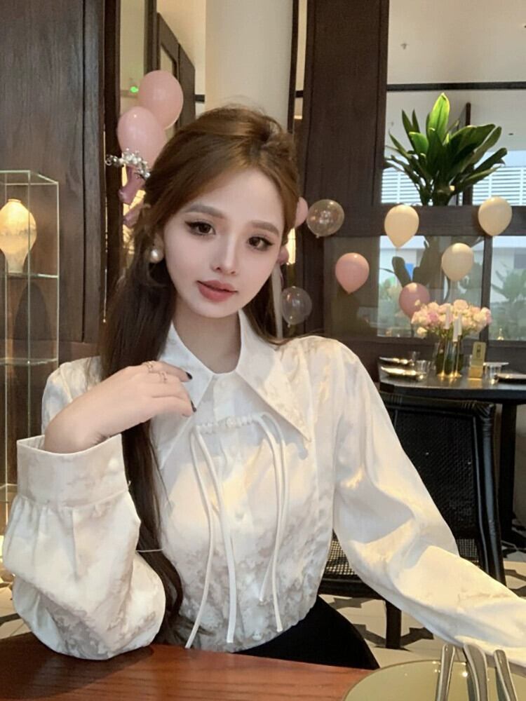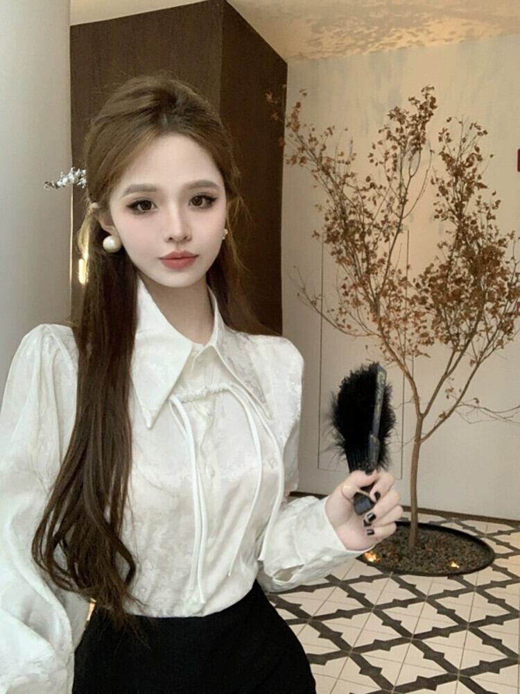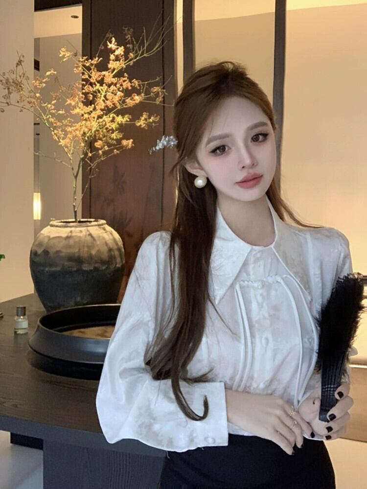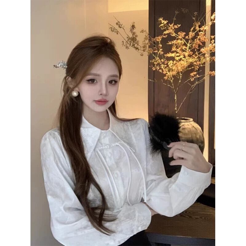 中国風国民風ジャカードシャツ女性の春デザインレトロバックル白シャツシックな長袖トップ ロング ホワイト スプリング 春物 missk78464052731