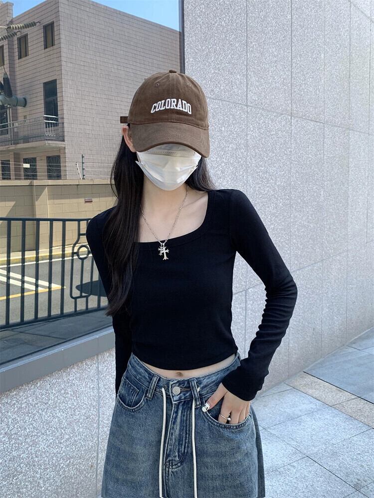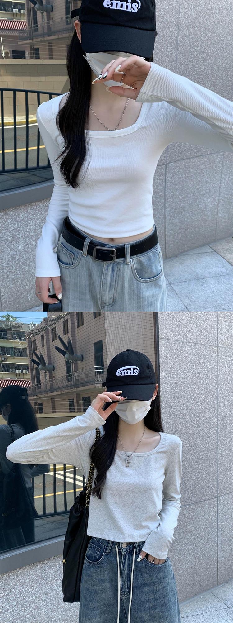 ホワイトスクエアネック Tシャツ女性春バージョン 2024 新しいスリムフィットショートベーシック長袖ボトリングシャツ ロング スプリング 春物 スクウェア missk12655601569