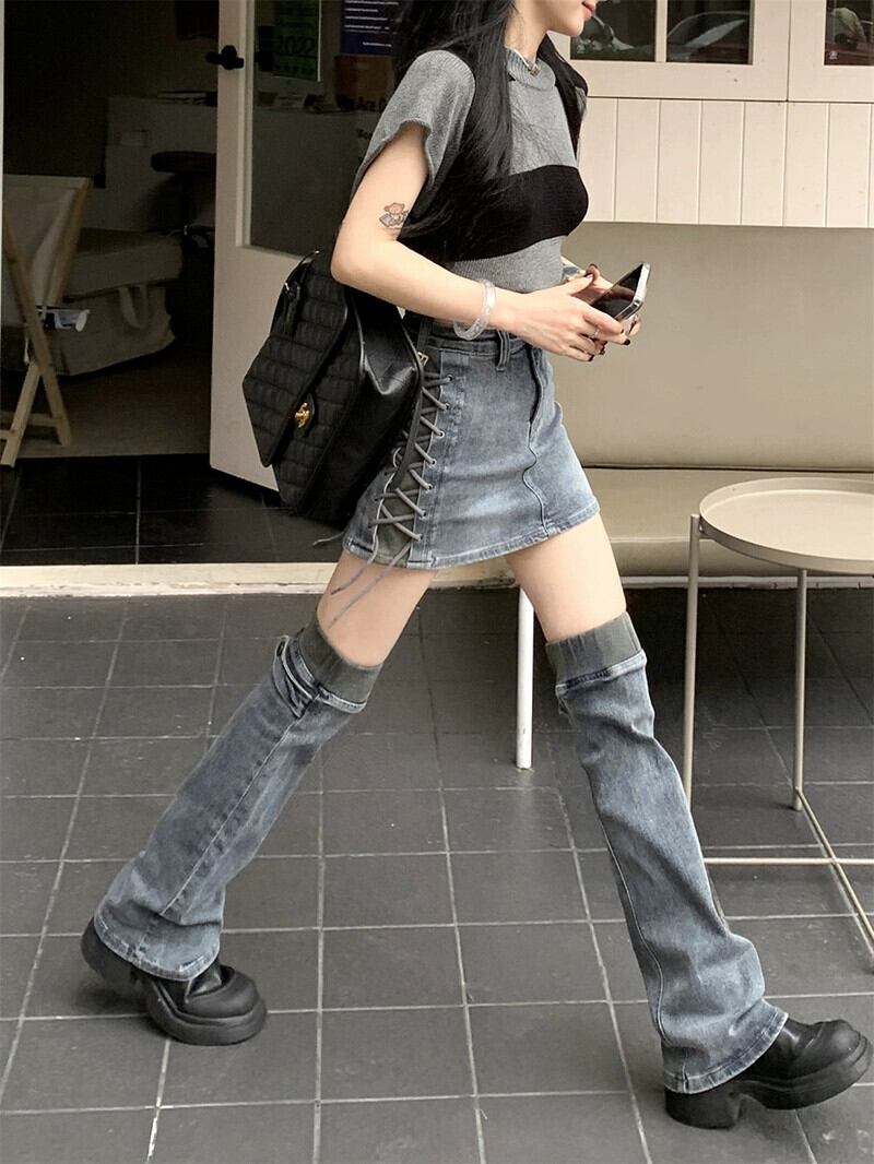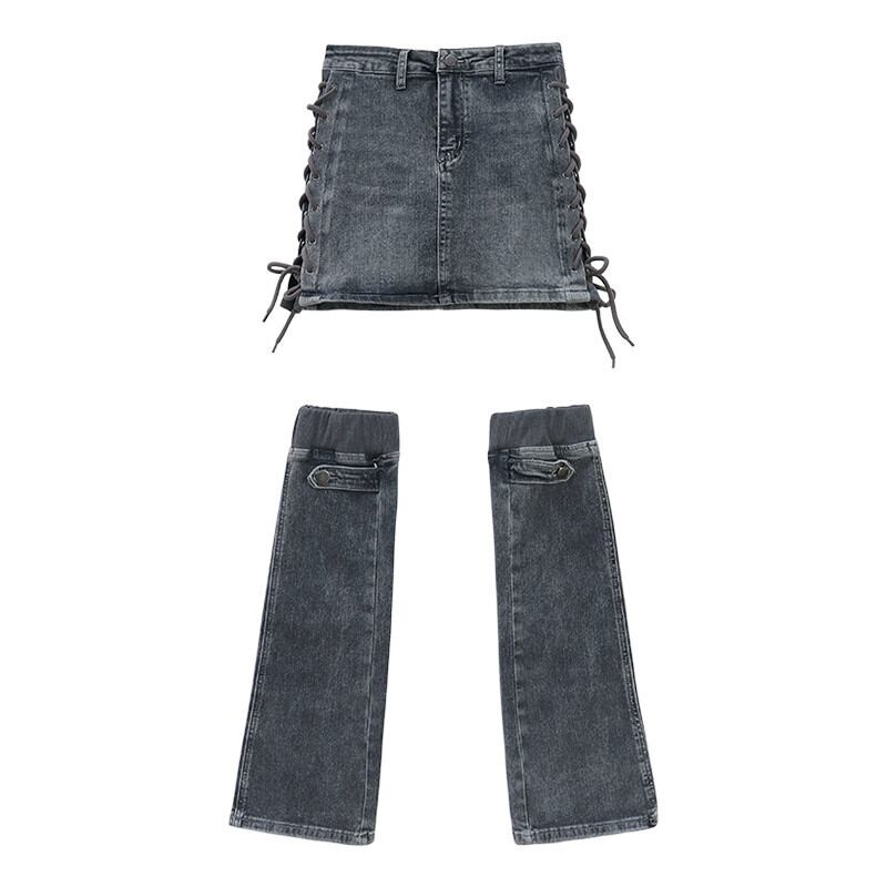 ホットデニムスカート + レッグウォーマー女性夏 2024 新しいストラップデザインハイウエスト弾性ヒップカバーショートスカート ハイウェスト エラスティック 伸縮 サマー 夏物 missk29700898858