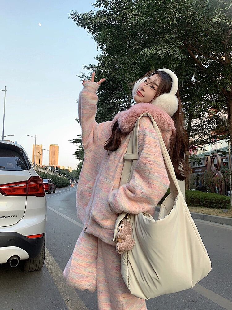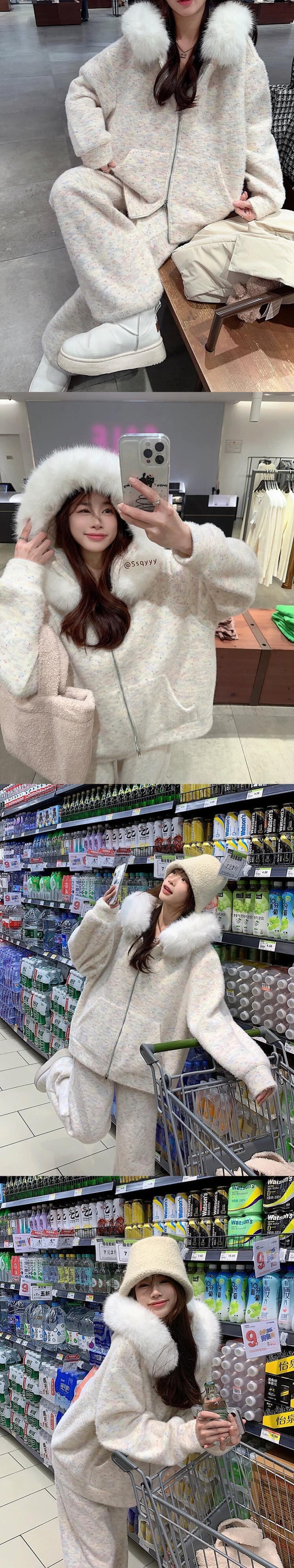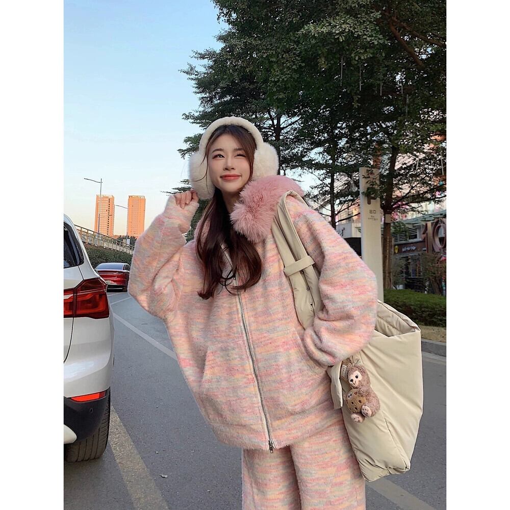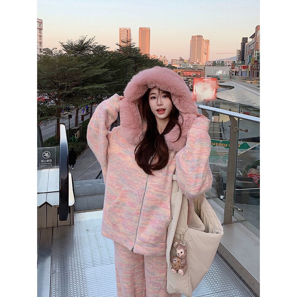 春の有能なスーツの女性、プラスベルベット、厚い毛皮の襟、スプライスされたフード付きスウェットシャツ、ジャケット、カジュアルなワイドレッグパンツ、2点セット スプリング 春物 missk72918648966