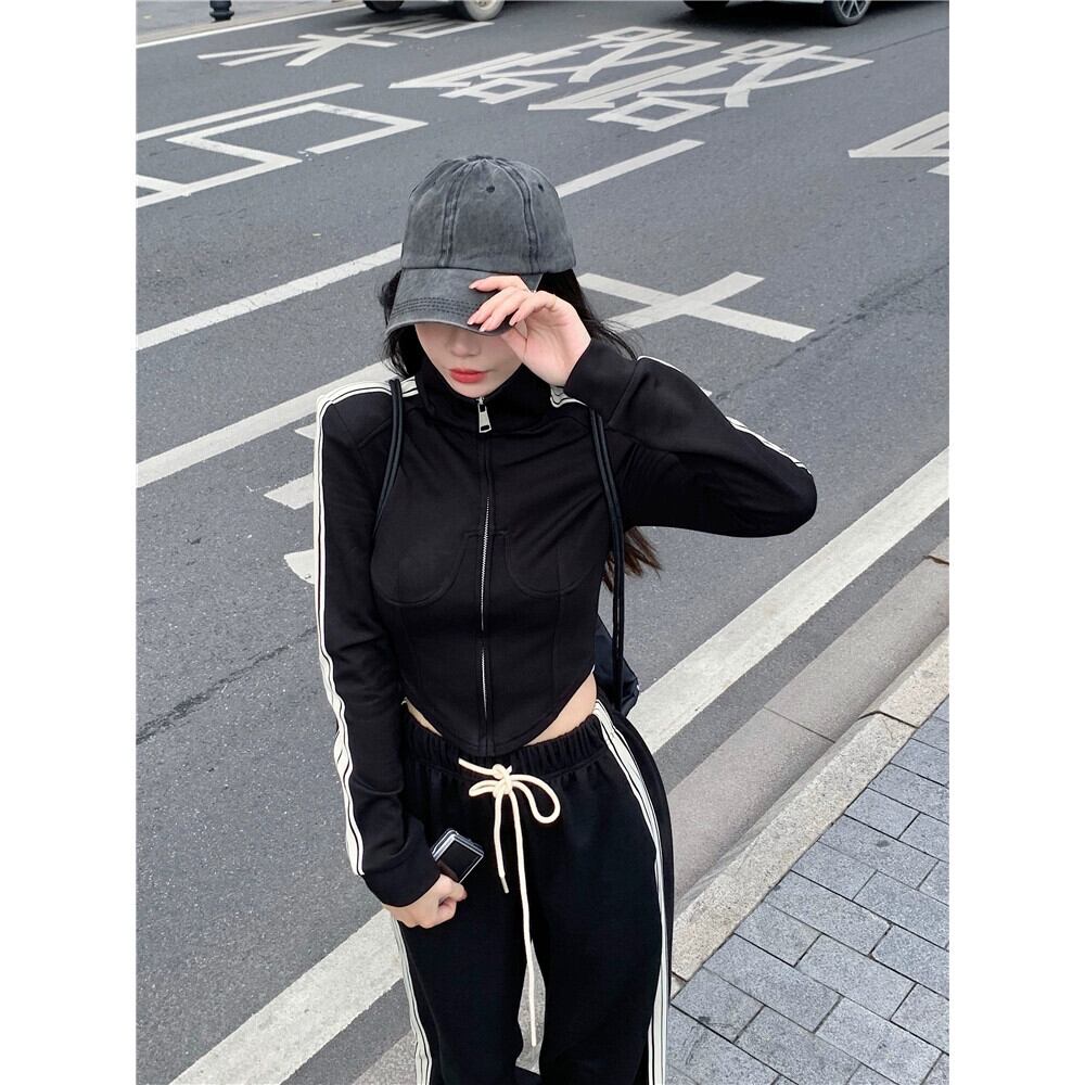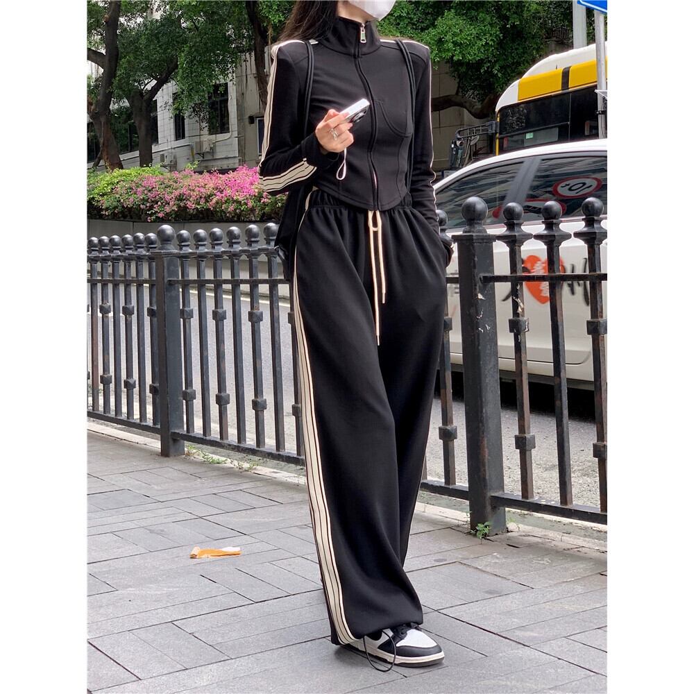 スポーツスーツレディース春新作ストライプコントラストショートジャケットハイウエストワイドレッグパンツ2点セットトレンディイン スプリング 春物 missk23578724841