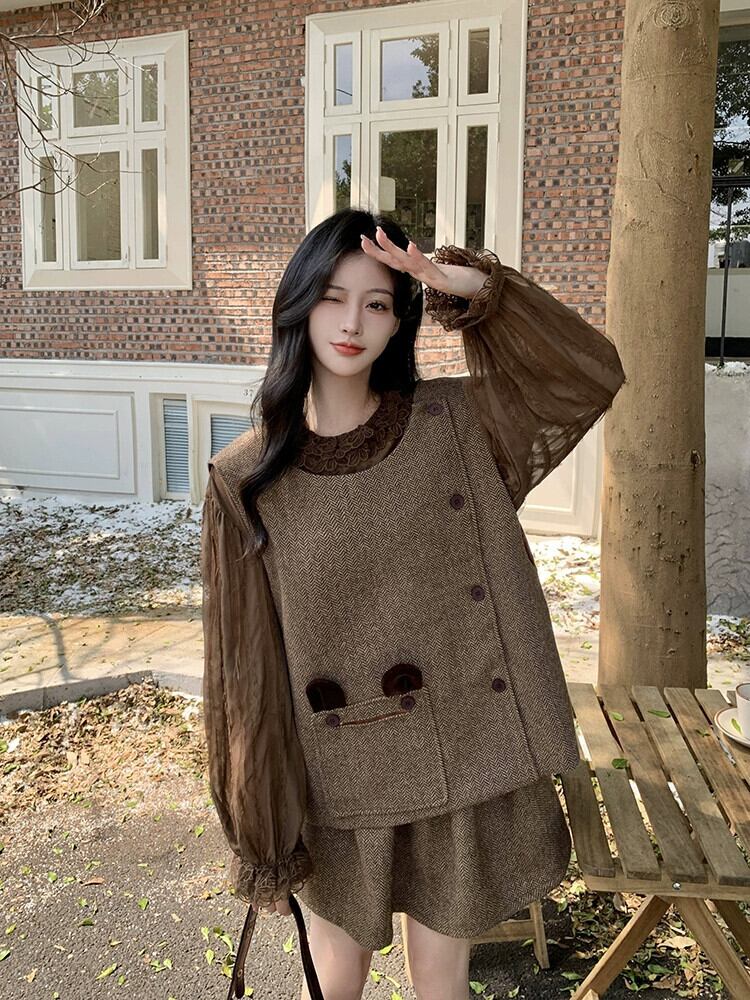 甘くてキュートなデザインのツーウェアベスト、長袖シャツ、スカートの女性の2024年春の新作3点セット ロング 大人ガーリー スウィート カジュアル スプリング 春物 missk45500200158