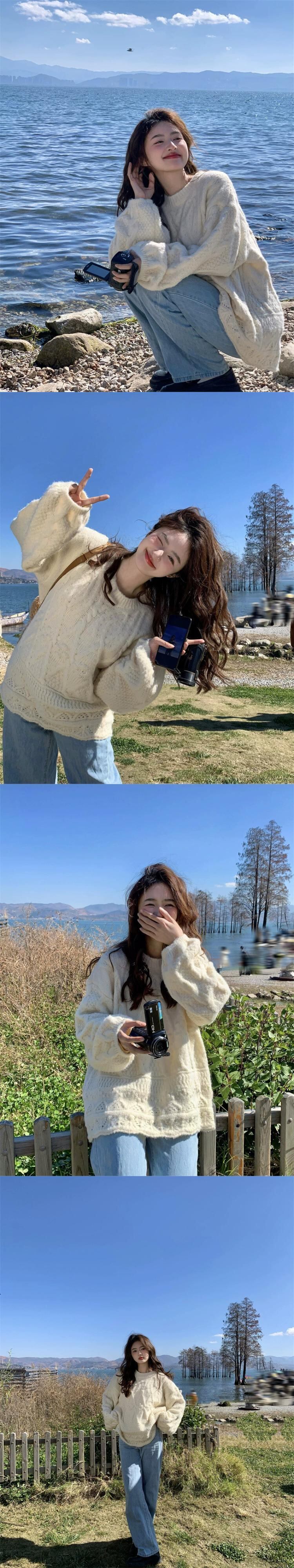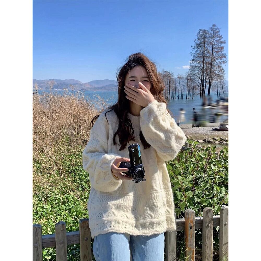 甘いツイストラウンドネック白セーター女性の春怠惰なスタイルルーズ肥厚長袖セータートップ ロング ホワイト 大人ガーリー スウィート キュート カジュアル スプリング 春物 Oネック missk43237321027