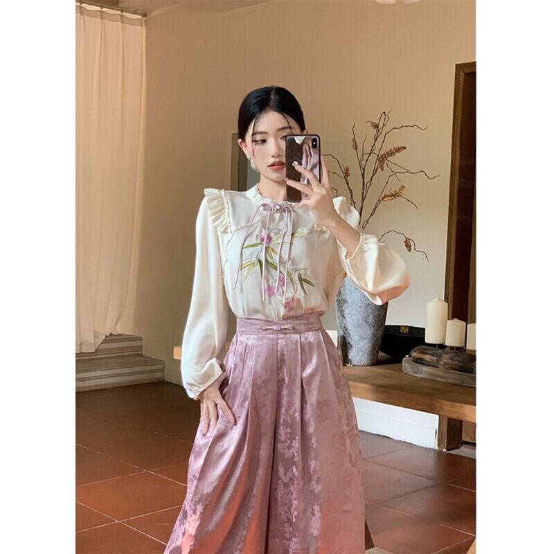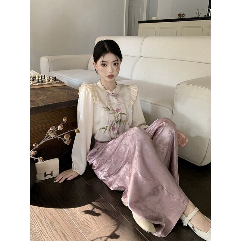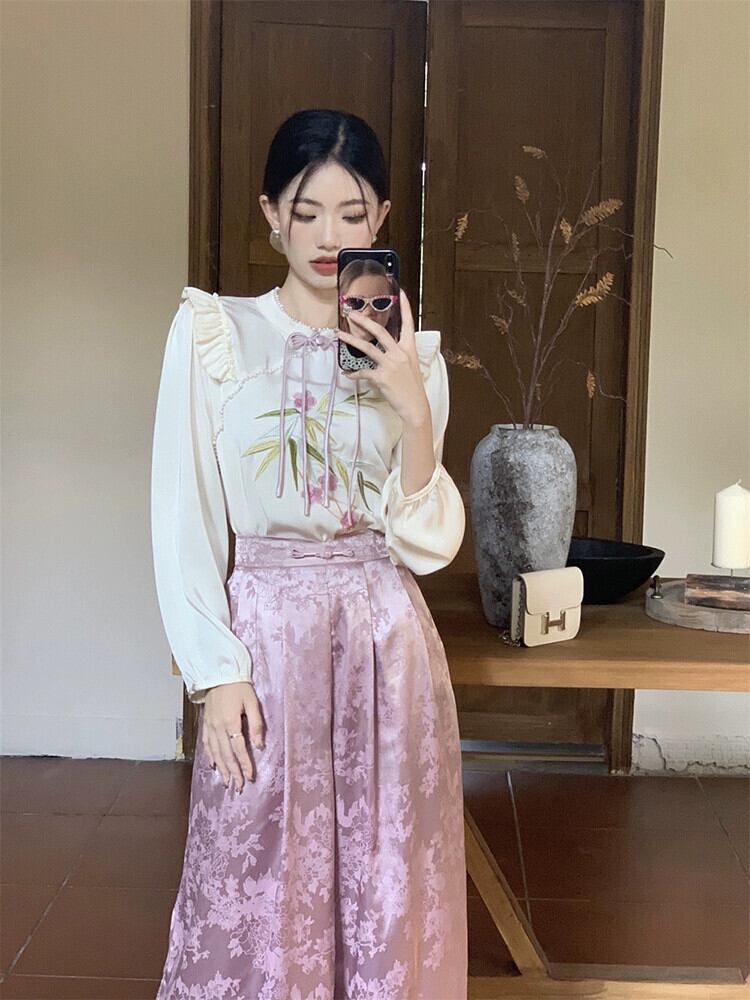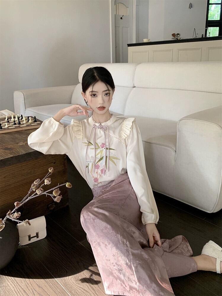中国風の刺繍ディスクボタン長袖シャツハイウエスト A ラインスカート女性 2024 春の新ツーピースセット ロング レッド スプリング 春物 Aライン missk84931115057
